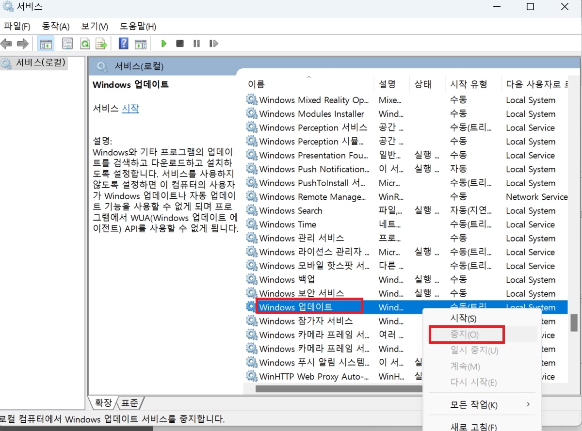 'Windows Update'와 'BITS'를 찾아 각각 마우스 오른쪽 클릭 후 중지를 선택합니다.